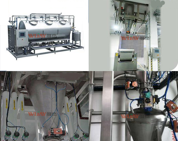 Powder material mixing and mixing system:Including feeding, conveying to storage tank, screw stirring device for powder mixing, vibrating screen, weighing and metering device, pneumatic butterfly valve and mixing tank for solid and liquid mixing, electric control system to control powder mixing, accurate metering and mixing, Wijay