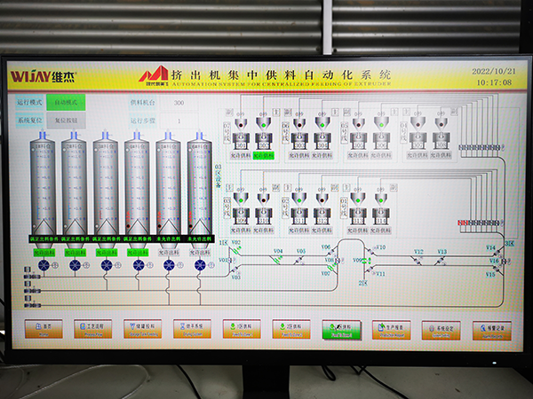 The innovative material automation system designed by Wijie continuously supplies 6 different materials to 46 large sheet extruders of customers, the feeding speed reaches 36T per hour, the conveying distance exceeds 200 meters, the material storage capacity reaches 1200 tons, and realizes the real-time monitoring and control of the material temperature and temperature, which is the traditional way of combining multiple small dryers and suction units. Functions that cannot be implemented.