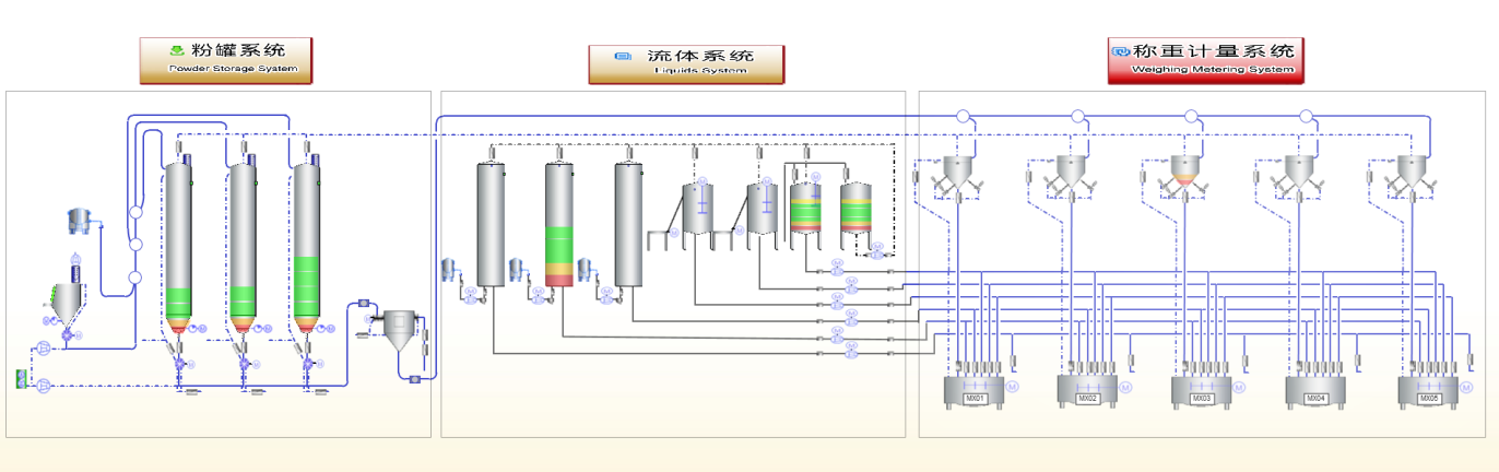 The system not only has the advantages of centralized feeding management, but also has the advantages of high efficiency, high stability and high cleanliness of automatic battering. Through the seamless connection of the two, large enterprises can shorten the process and time from the raw material manufacturer to the final workshop use point, realize unmanned operation, realize 24 hours of high load production in a real sense, and solve the shortage pressure of large international enterprises during the peak production period. More enterprises to digital information intelligent transformation provides the technical basis. Mainly suitable for a variety of raw materials (fluid, solid) formula, large output of large modern enterprises.