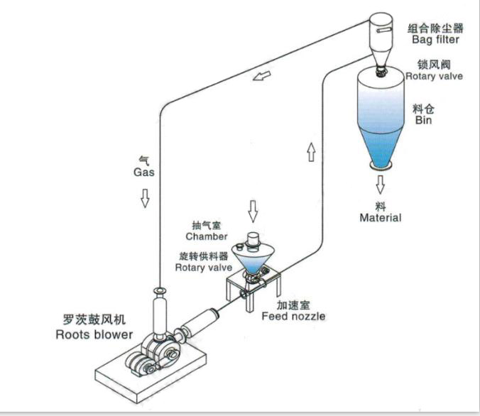 Generally, Roots blower is used as the air source, and rotary blanking valve is used as the feeding device. Materials fall into the conveying pipeline through the rotary blanking valve, and are mixed with high speed air before being transported to the target receiving bin. The inert gas filtered through the dust removal and pressure relief device is re-connected to the entrance of Roots blower. Suitable for chemical instability, flammable, explosive material conveying project (lithium electric positive and negative electrode material conveying).