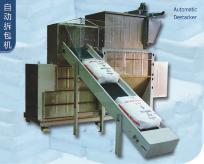 Automatic unpacking machine is mainly used to unbag and unload the bagged powder particle material. The bag is bagged by the automatic feeding device or manually, and the bagged powder particle material is automatically transferred to the skateboard at a 45 degree Angle through the bag conveyor, and the bag is slid along the skateboard by the gravity of the material bag, and the bag is cut open by the rapidly rotating blade during the sliding process. The cut residual bag and material slide into the bag separator for screening, and the material separated from the bag separator is collected by the material collector and output to the storage through the bucket elevator. Advantages: The automatic dismantling machine has the characteristics of reliable working performance, low power consumption, low noise, low failure rate and easy operation