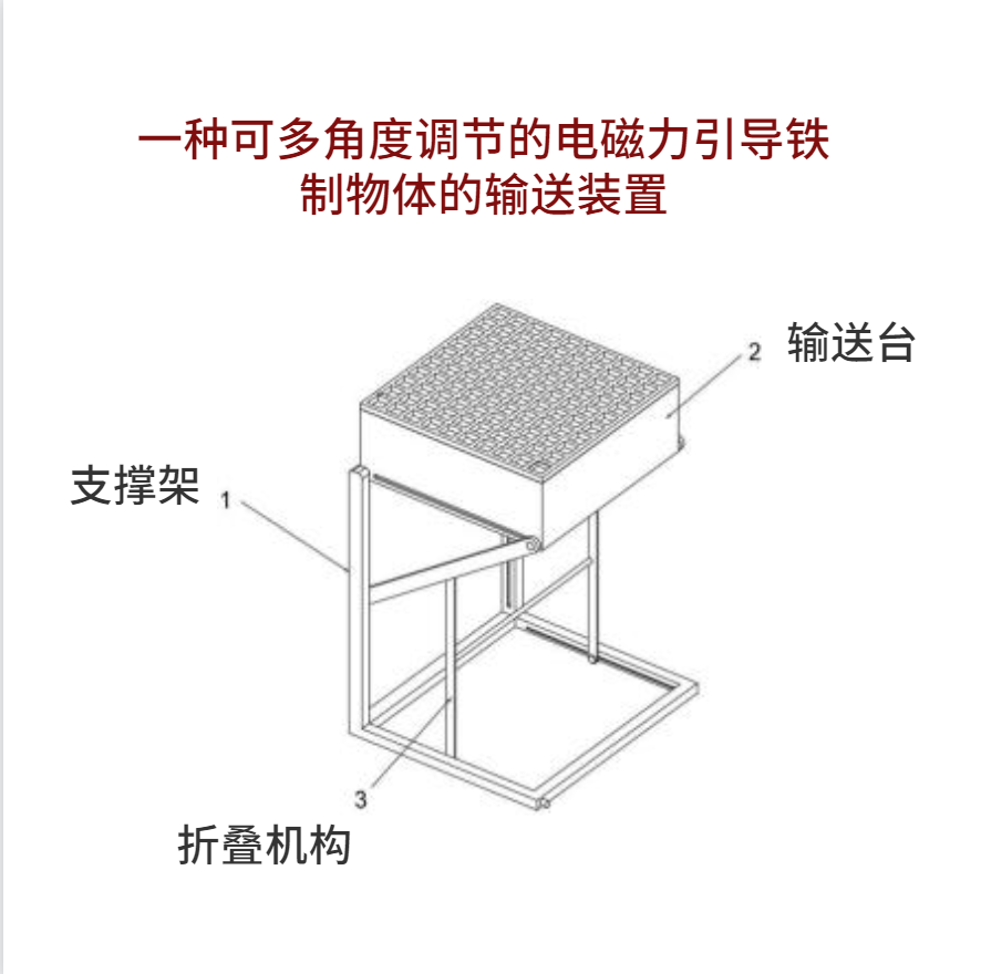 The invention relates to the technical field of conveying iron objects, in particular to a conveying device for guiding iron objects with an electromagnetic force that can be adjusted at multiple angles. The folding mechanism comprises at least a first folding arm and a second folding arm, the side wall surface of one end of the first folding arm is provided with a first connecting hole, the side wall surface of the other end of the first folding arm is provided with a second connecting hole, the center of the lower surface of the first folding arm is provided with an hinged slot, a fixed column is fixed in the hinged slot, and an hinged rod is hinged on the fixed column. One end of the articulated rod is provided with a first articulated hole, the first folding arm and the second folding arm are symmetrically arranged, through the folding mechanism set, through the folding connecting rod structure composed of the first folding arm and the articulated rod, the conveyor table can be flipped, and then the plane, inclined plane and vertical plane conveying state can be switched at will, at the same time, the folding mechanism provides support for the conveyor table. To ensure the stability of the conveyor table.